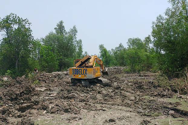 আঙ্গারপাড়া থেকে কিছু দূরে চাউলাপাড়া গ্রামে গিয়ে দেখা যায়, একইভাবে কয়েক হাজার ছইলা ও কেওড়াগাছ কেটে প্রায় দুই একর জমির মাটি খনন করে ঘের বানানো হচ্ছে। ওই এলাকার বাসিন্দারা জানান, স্থানীয় বাবুল মৃধা ও জাকির মৃধা নামের দুই ভাই এই ঘের বানাচ্ছেন।