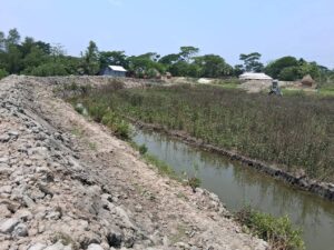 ওই এলাকার আঙ্গারপাড়া গ্রামে দেখা যায়, বন্যা নিয়ন্ত্রণ বাঁধ ঘেঁষে প্রায় ১৫০ মিটার এলাকাজুড়ে গাছ কেটে উজাড় করা হয়েছে। সেখানে খননযন্ত্র (এক্সকাভেটর) দিয়ে মাটি কেটে ঘেরের জলাধার নির্মাণ করা হচ্ছে।