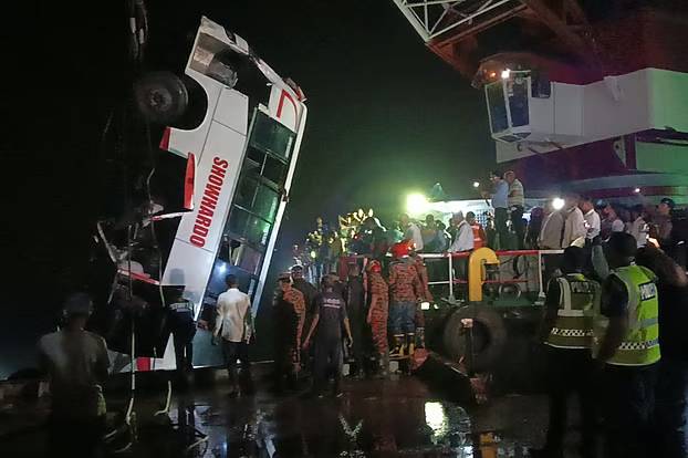রাজবাড়ীর গোয়ালন্দ উপজেলার দৌলতদিয়া ঘাটে পন্টুন থেকে পদ্মা নদীতে পড়ে যাওয়া বাসটি ৬ ঘণ্টা পর টেনে তুলেছে উদ্ধারকারী জাহাজ হামজা। বুধবার রাত সোয়া ১১টার দিকে বাসের একটি অংশ দৃশ্যমান হয়। সাড়ে ১১টা নাগাদ পুরো বাসটি জাহাজ হামজার ক্রেন দিয়ে টেনে পানির ওপরে তোলা হয়।